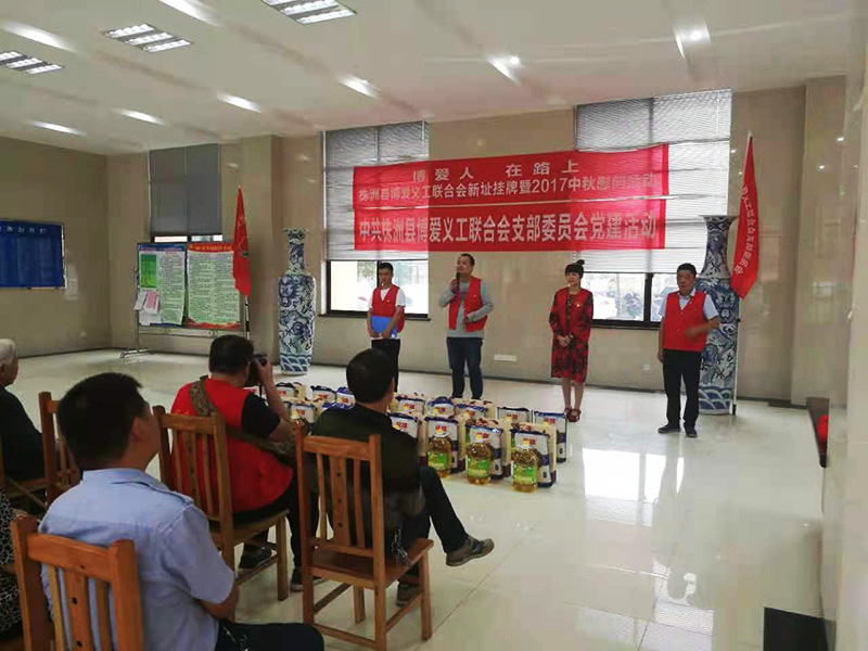 株洲市醫(yī)藥有限公司黨支部成立之初,就加入了“株洲縣博愛義工聯(lián)合會”,積極參與義工活動。2017年9月,株洲市醫(yī)藥有限公司黨支部被株洲縣博愛義工聯(lián)合會授牌為“副會長單位”。授牌當(dāng)天,還為20戶貧困家庭送去了中秋祝福和節(jié)日慰問物資。